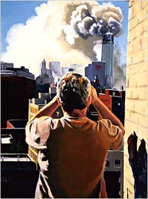 There’s Hugh, in his wife Jayne Holsinger’s painting, on the roof of Westbeth, back to the viewer, binoculars to his eyes, as he gazes downtown at the Twin Towers shortly after the planes have slammed into them. It’s a very bold picture. I have always regarded it as a portrait of Hugh, which makes for its daring. In portraits, the facial features of the main figure are the summum bonum of the genre, the conveyers of psychic life and its relation to station in life or to the surrounding environment. But here, those features are out of the viewer’s sight, turned away, as if the artist were refusing to participate in a cliché.